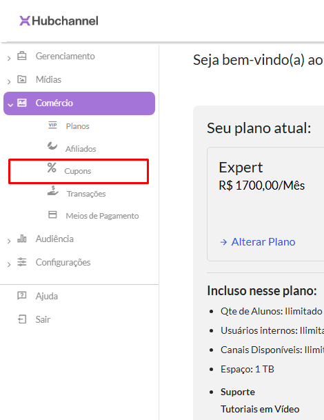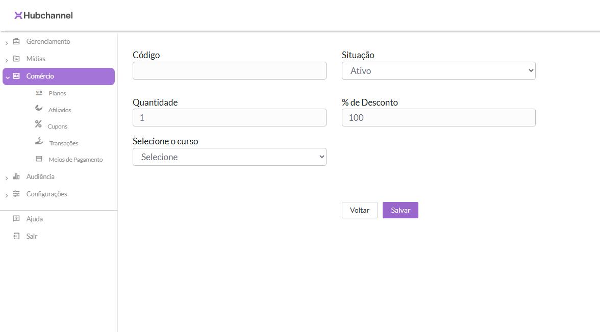 Selecione o curso: escolha o curso/canal pago ao qual o cupom será vinculado