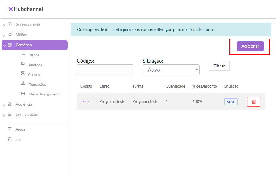 Na parte superior da tela, clique no botão Adicionar para iniciar o cadastro de um novo cupom.