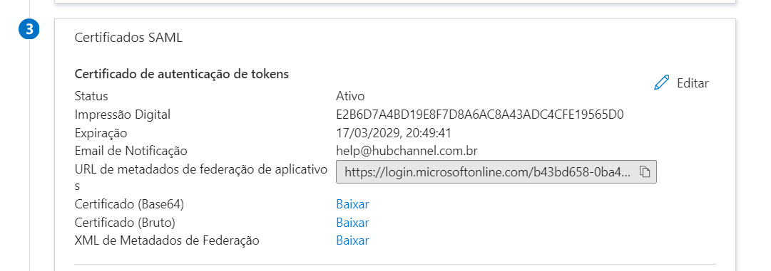 | URL de metadados SAML | App Federation Metadata Url do Azure | |